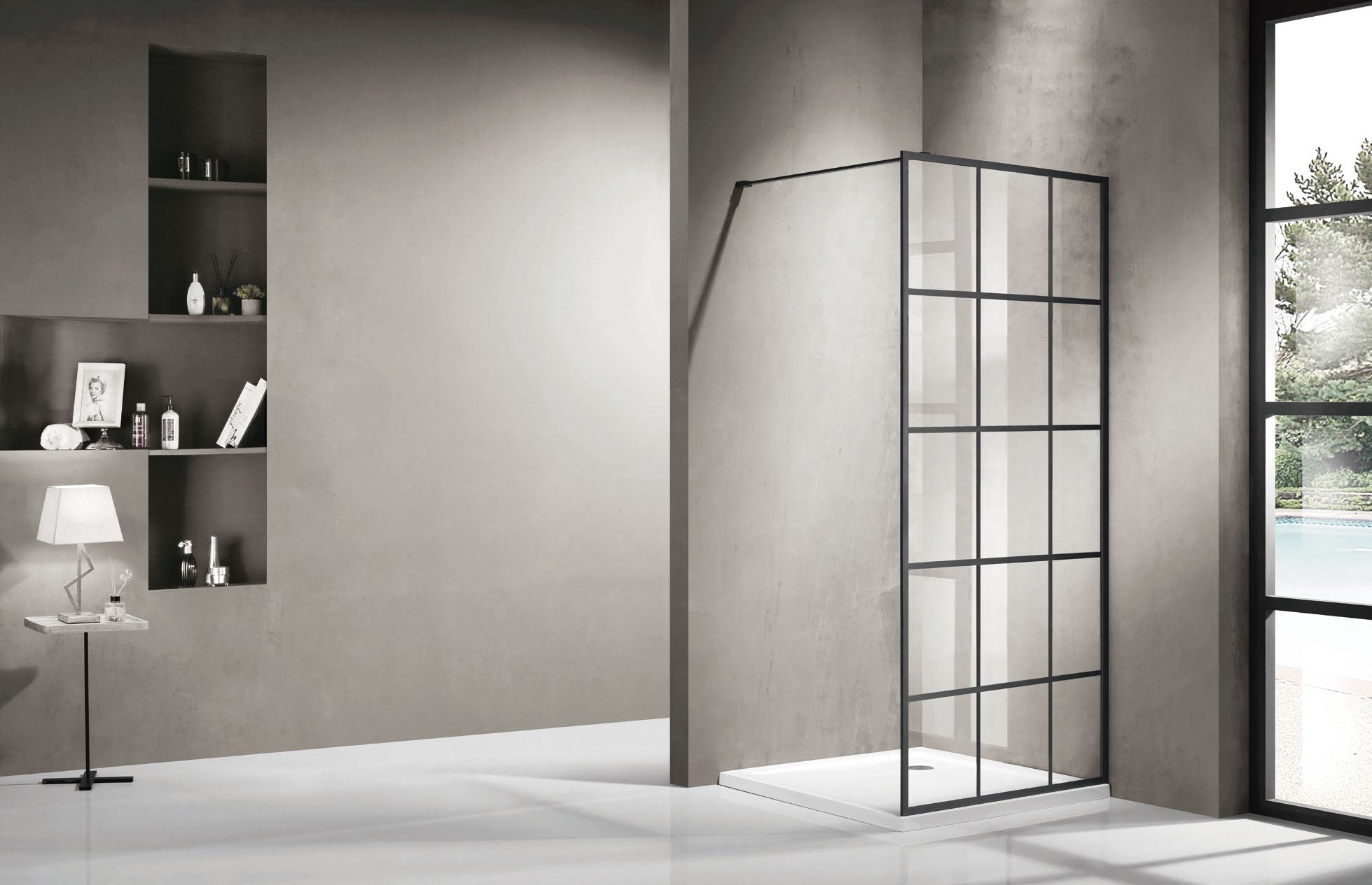 Black Framed Shower Screen Fixed Panel with grills. 2000mm high x 1200mm wide
