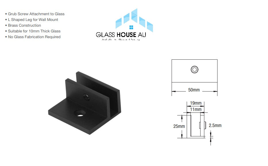 Made of solid brass, the Square No Drill Clamp With Leg for 10 mm Glass is available in several finishes. This clamp provides an alternative to clamps which require drilled holes or notches in the glass. A single nylon tipped grub screw is tightened to secure onto 10 mm glass.