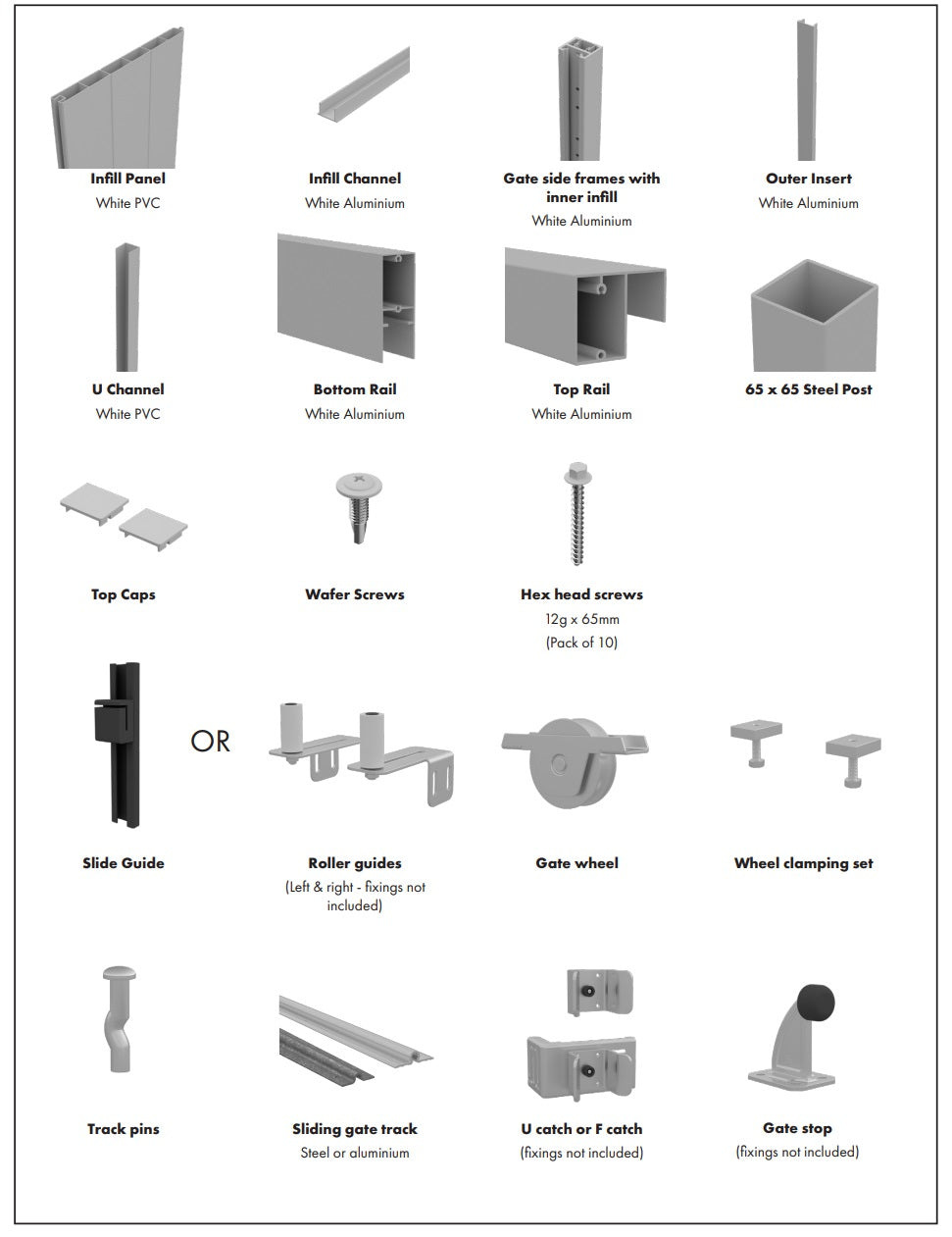 Infill panels white PVC, Infill Channel, Gate side frames with inner infill, Outer insert, U Channel, Bottom rail, Top rail, 2x65x65 steel post, Top caps, Wafer screws, Hex head screws, Slide guide or roller guides, Gate wheels, Wheel clamping set, Track pins, Sliding gate track, U catch, Gate stop.