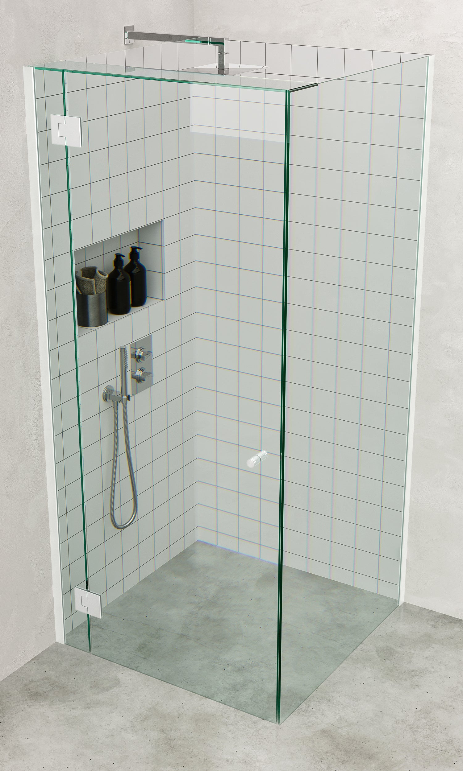 Matt White Frameless Corner Shower Screen with extended Dry Glaze U Channels
