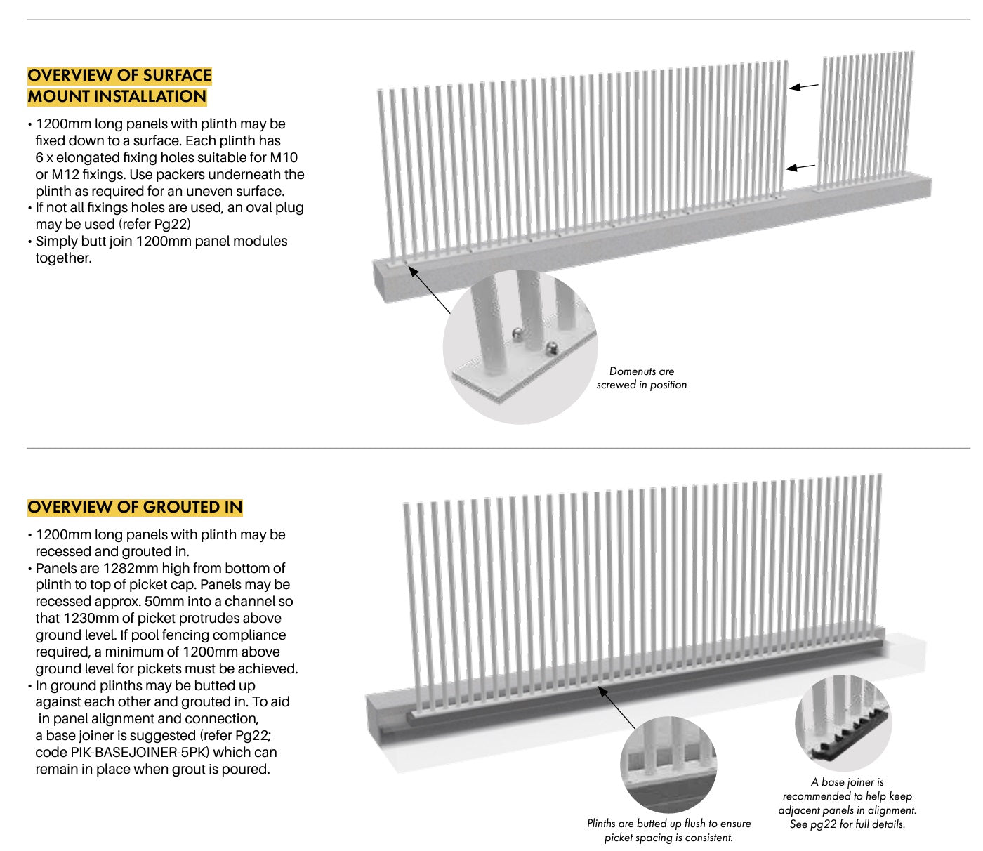 Installation: Can be fixed to concrete, timber, or grouted in. PVC base plate cover must remain during install.