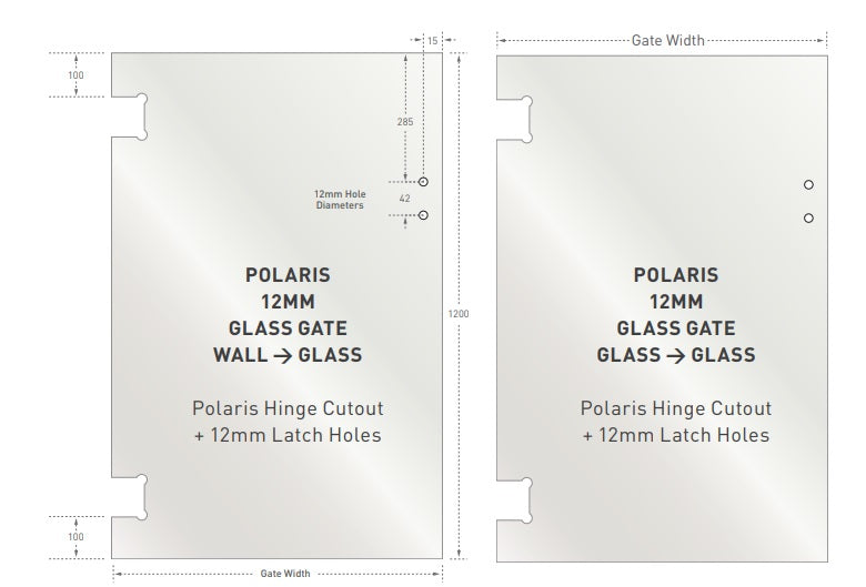 range of Polaris hinge panels are 12mm Grade A toughened glass in sizes ranging from 1000mm to 1600mm for use with our premium Polaris self closing glass gate hinges.
