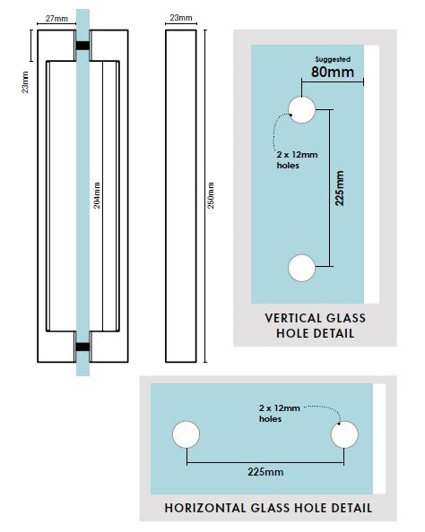 • Back to back pull handle; suits 8mm, 10mm and 12mm glass